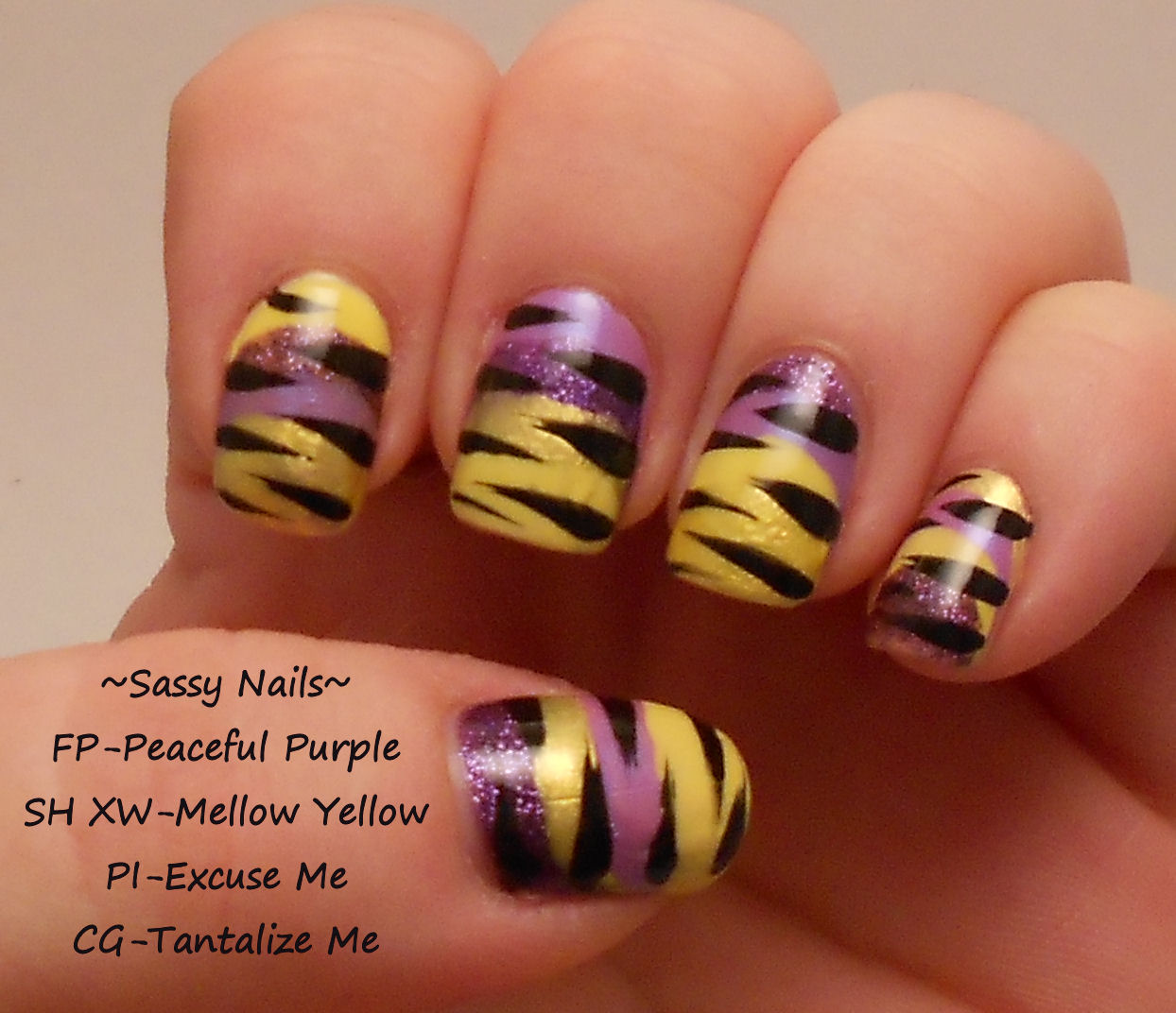 Well I was having a hard time choosing/figuring out what I wanted to do with my nails. So I posted on my FB page for people to give me an idea. My cousin Julie, suggested Zebra. I asked her about colors, she said Purple and Yellow....